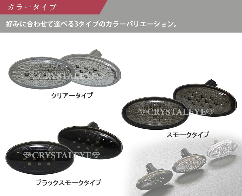 New release!! For Suzuki models (check compatibility chart) LED Crystal LED Side Marker This is an impactful sequential turn signal type. Crystal Eye's new product Finally, the sequential turn signal type that flows on the LED side marker is here. Moreover, the brightness when lit with 10 high-brightness SMD chip type LEDs is the limit, and the side view with the LEDs lit up in small particles is outstanding. Coupler-on with built-in hyper flash prevention resistor. ■New left and right set ■Built-in hyper flash prevention resistor ■Coupler-on ■High brightness SMD type LED 10-piece specification ■Color: Clear/Smoke/Black Smoke Compatible models Please check the compatibility chart (There are also compatible models that are not listed in the compatibility chart. Please contact us.) *Please check that the shape of the LED side marker is the same as the original before purchasing. *Some models require a simple small modification to cut the coupler insertion port with a cutter. *Only some models have a model where the turn signal flow is reversed on the left and right. In that case, the coupler pins need to be swapped.