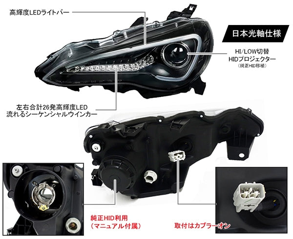 TOYOTA 86/Hachiroku genuine HID car Crystal Eye LED light bar headlight V3 with flowing turn signal specification. High brightness LED light bar shines as if it surrounds the headlight. Recommended for those who have given up on lowering the car due to the height of the turn signal, which is a source of trouble for 86, this is a headlight with built-in high brightness LED turn signal with a total of 26 LEDs on the left and right. You will need to transplant the HID from the genuine headlight to this headlight. There are two colors: sporty black type and high-end chrome type. ■New left and right set ■Flowing turn signal specification ■Manual included ■Built-in high flash prevention resistor ■High brightness LED light bar ■LED turn signal 26 lights on the left and right ■High/low switching projector Compatible models Toyota 86 / *BRZ *For genuine HID cars For early cars (until July 2016) (*Cannot be installed on later models) *For halogen cars, please purchase the halogen car version. *Depending on the vehicle specifications, the turn signal light may not turn on properly unless you remove the turn signal bulb inside the bumper. *For the BRZ, depending on the vehicle specifications, you may need to take measures against hyper flashing, such as using an IC relay to prevent hyper flashing.