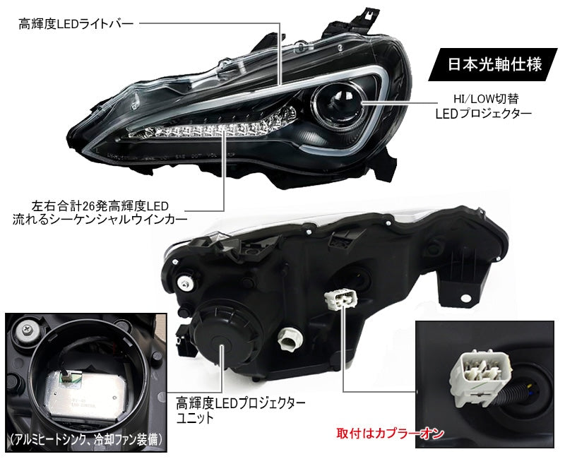 | Product Description | Crystal Eye LED Light Bar Headlight V5 for TOYOTA FT 86/Hachiroku SUBARU BRZ, now available with full LED headlights and sequential LED turn signals. This LED projector has a brightness that will satisfy you. Until now, it was only available for the early model, but now it is compatible with the later model, so it can be installed on vehicles other than early halogen cars. Available in two colors: sporty black and high-end chrome. Brand new left and right set. High/low switching high-brightness LED unit. Manual included. Built-in high-flash prevention resistor. High-brightness LED light bar. LED turn signals: 26 total on each side (sequential LED turn signals). 180-day warranty against LED burnout (*1). Compatible models: Toyota 86 (ZN6) early/late (HID/LED headlight vehicles) Subaru BRZ (ZC6) early/late all models. *Cannot be installed on halogen-powered 86 vehicles (early G grade, RC grade). *For early models, depending on the vehicle specifications, the turn signal bulbs in the bumper may need to be removed in order for the light to turn properly. In that case, the problem can be resolved by replacing the turn signal with a high-flash prevention relay. *For early BRZ models, it may be necessary to replace the turn signal with a high-flash prevention IC relay. *1 The warranty will be handled according to the warranty terms. |