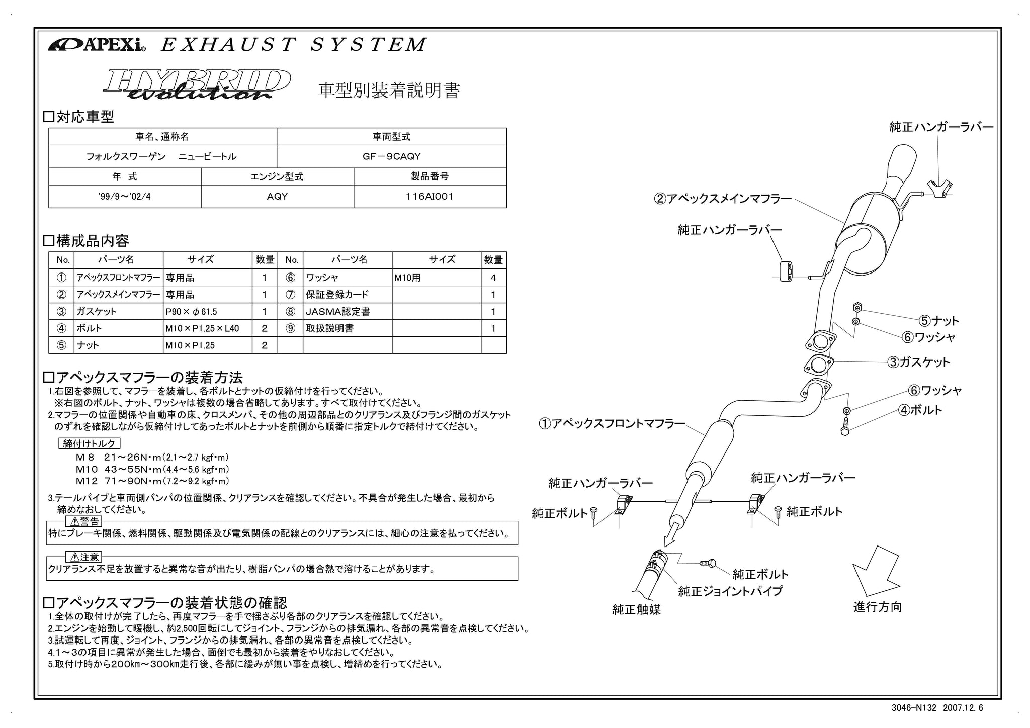 | Product Description | Model Year: 99/09-02/04 Main Pipe Diameter: Ï_54 ___ Ï_60 No of Pieces: 2 Tail Diameter: Φ105 Oval Exhaust System Type: Exchange immediately after the SUPER CATALYZERlyst Sound Level: 90 Ground Cleance :120 |