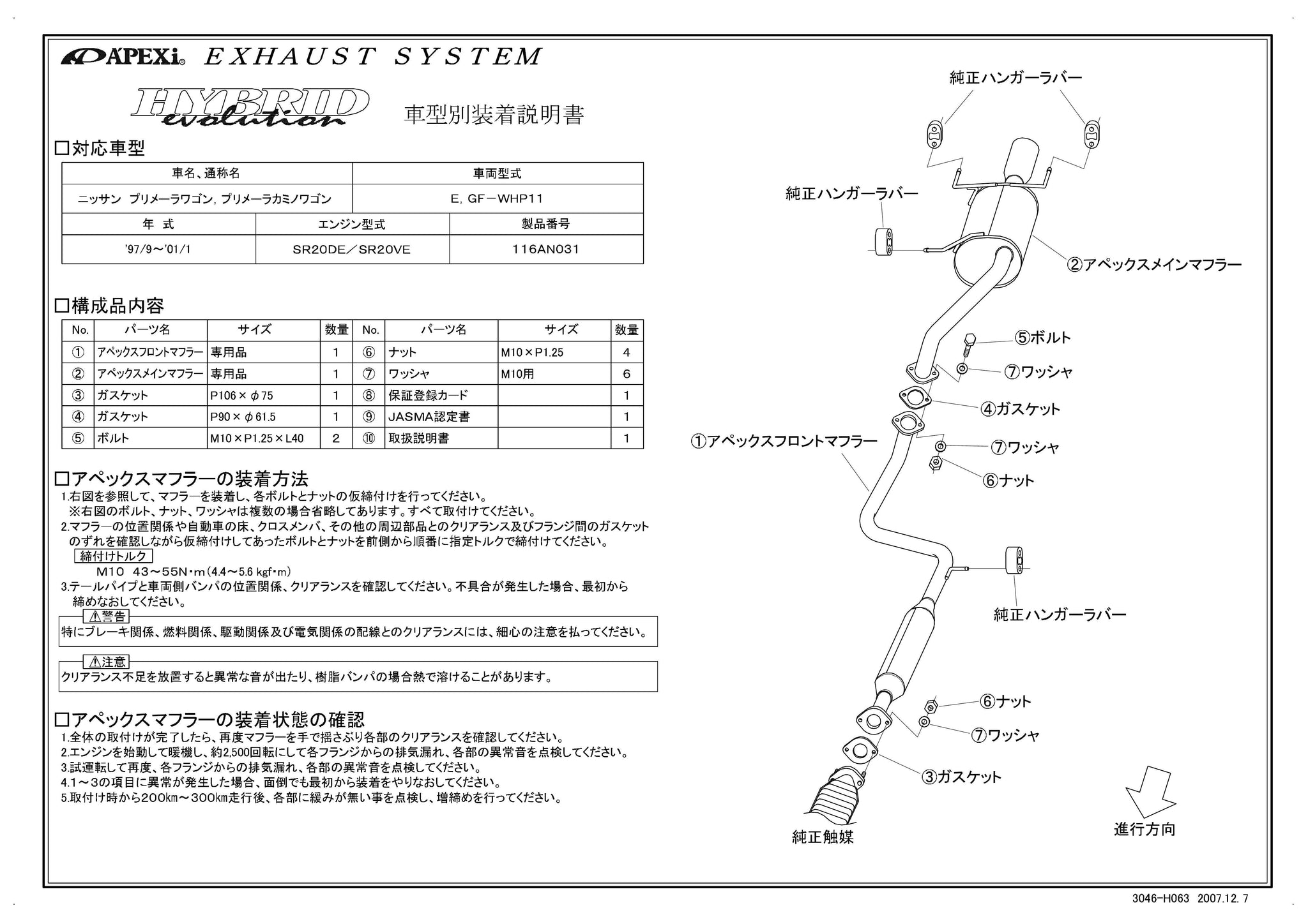 | Product Description | Model Year: 97/09-01/01 Main Pipe Diameter: Ï_54 ___ Ï_60 No of Pieces: 2 Tail Diameter: Ï_105 Oval Exhaust System Type: Exchange immediately after the SUPER CATALYZERlyst Sound Level: SR20DE: 88 / SR20VE: 93 Ground Cleance :135 |