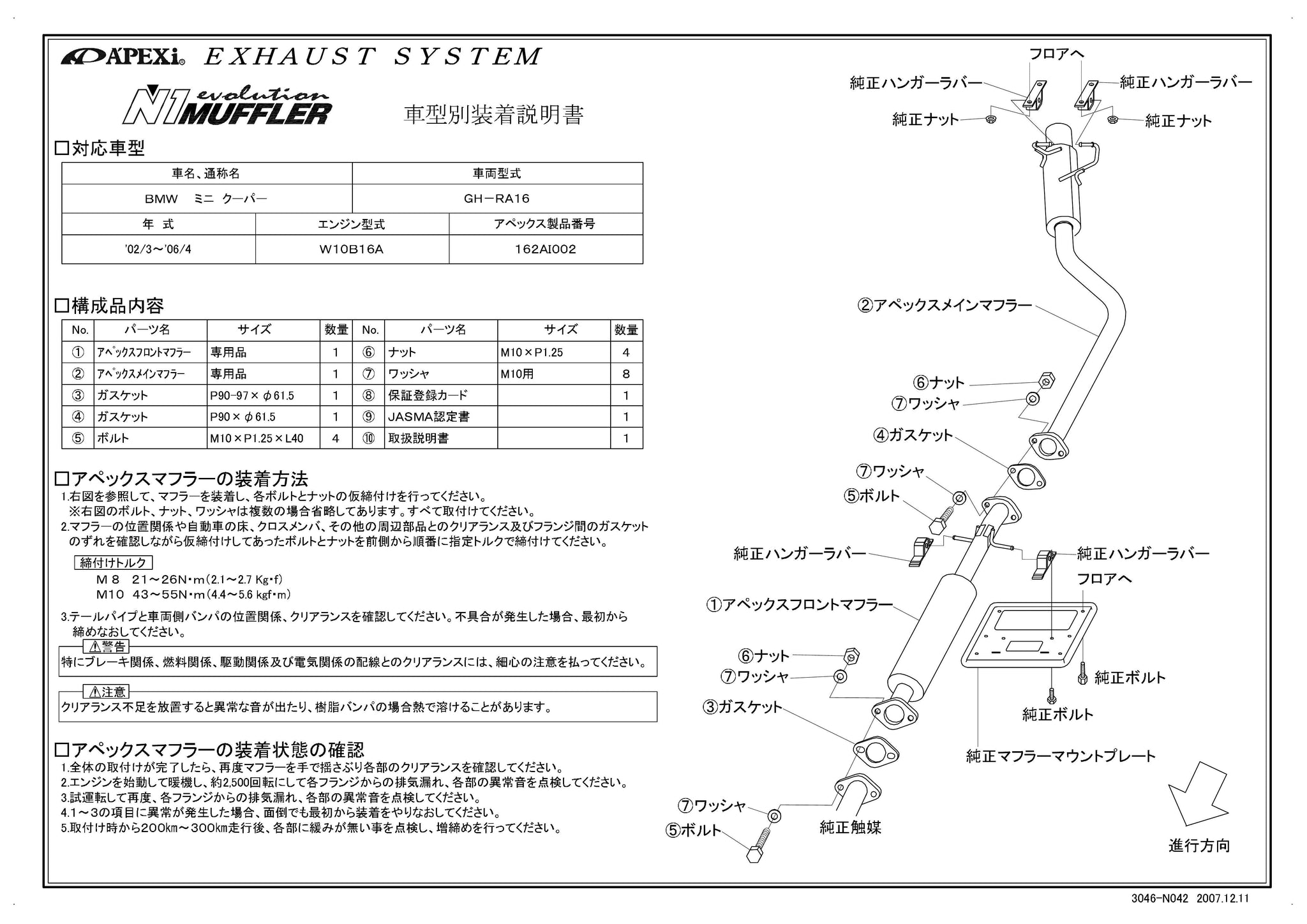 | Product Description | Model Year: 01/10-06/04 Main Pipe Diameter: Ï_54 No of Pieces: 2 Tail Diameter: Ï_120 / Ï_90 Exhaust System Type: Exchange immediately after the SUPER CATALYZERlyst Sound Level: 93 Ground Cleance :180 |