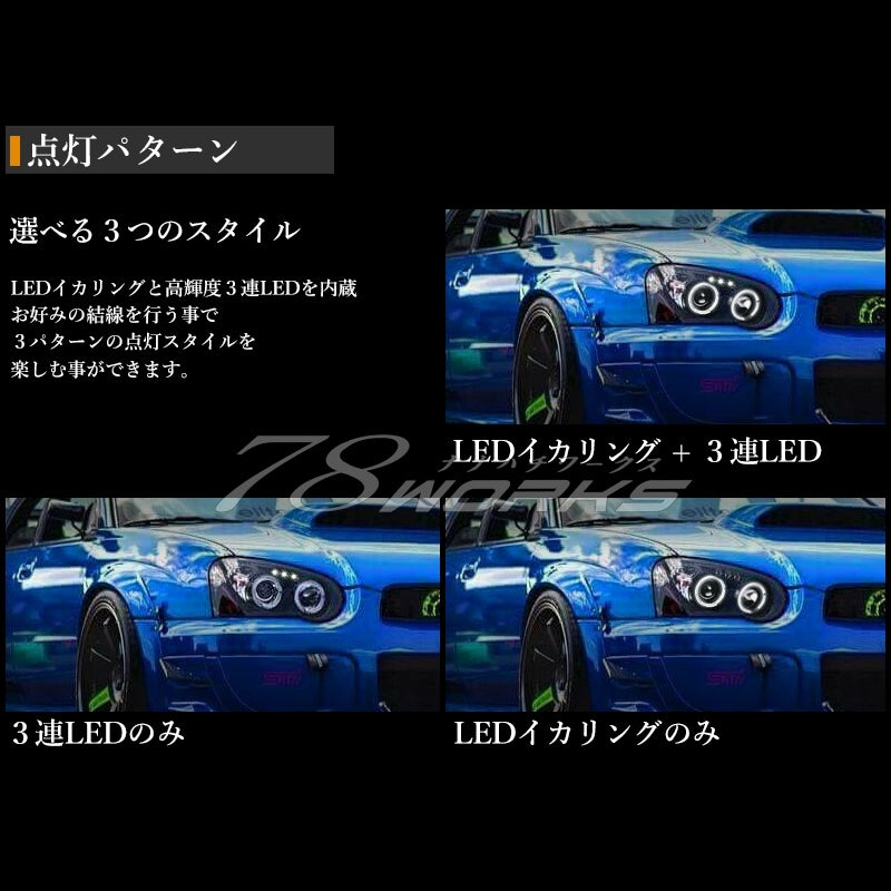 Product Description | One set (left and right), black, Japanese beam specification, high-brightness triple LED, bulb included, LED squid ring, socket-on installation (only turn signal socket needs modification), three lighting patterns. Compatible models: GD GG series mid-term halogen-powered vehicles, 2002 (Heisei 14) - 2005 (Heisei 17) Impreza Sedan, WRX STI, Impreza Sport Wagon GD9, GDA, GDB, GD2, GD3, GG2, GG3, GG9, GGA |