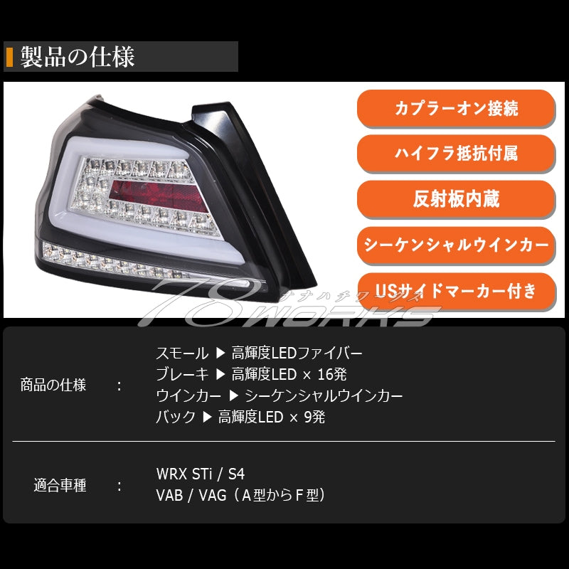 Product Description | ・One set (left and right) ・Built-in LED side markers ・Includes a resistor to prevent hyper flashing ・Flowing turn signal type (no flashing setting) ・Plug-in connection 【Compatible models】 SUBARU WRX STI / S4 VAB / VAG (A to F models) |