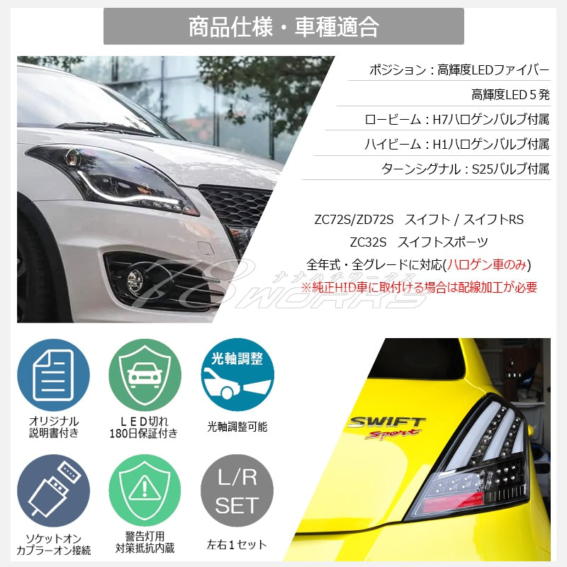 Product Description | ▼ Achieve a modern style ▼ A favorite among many overseas users, this popular model with a completely new front end featuring fiber LEDs is back in stock! Perfect not only for dressing up your vehicle, but also for refreshing old, dull factory lights. ■ Set of 1 (left and right) ■ Black type ■ Plug-and-play connection ■ Reliable Japanese beam specification (for left-hand driving lane) ■ 180-day warranty against LED burnout ■ Includes original 78WORKS manual ■ Adjustable beam axis (up/down/left/right) --- Compatible Vehicles --- Model: ZC72S / ZD72S / ZC32S Vehicle Name: Swift / Swift RS Swift Sport Year: September 2010 (Heisei 22) to December 2016 (Heisei 28) *For halogen-powered vehicles ▼ Grade Compatible with all grades |