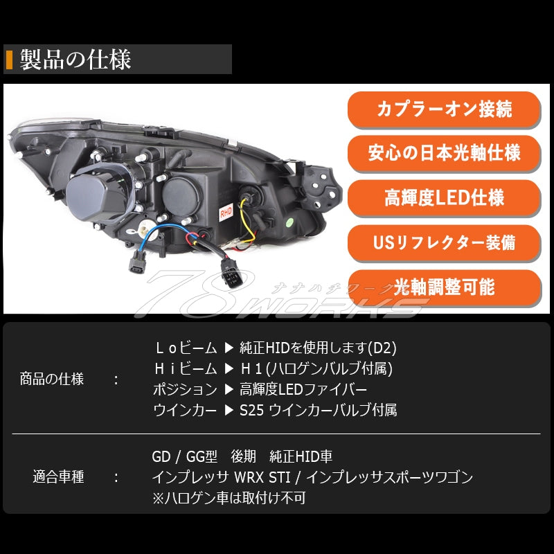 Product Description | One set (left and right) - Black - Japanese beam axis specification - 180-day warranty against LED burnout - High-brightness LED fiber - Adjustable beam axis - Factory HID transplant model - Amber reflector type [Compatible vehicles] GD GG series (late model, factory HID) 2005 (Heisei 17) - 2006 (Heisei 18) Impreza Sedan WRX STI Impreza Sport Wagon GD2 GD3 GDA GDB GDC GDD GG2 GG3 GGC GGD GGA |