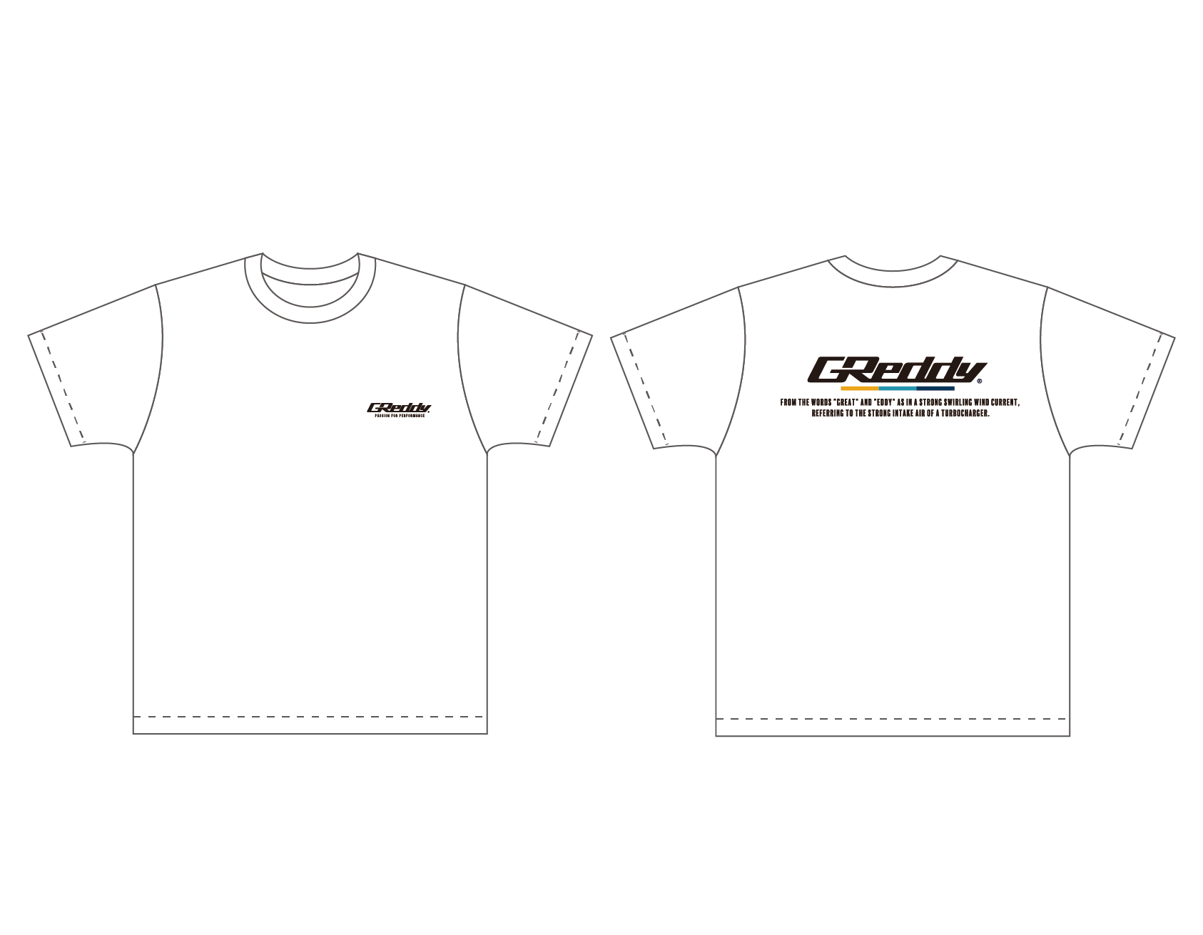 | Product Description | The T-shirt features the GReddy logo on the chest and the message on the back: "From the words 'GREAT' and 'Eddy' as in a strong swirling wind current, referring to the strong intake air of a turbocharger." (The words 'GREAT' and 'Eddy' evoke the strong swirling wind current and the powerful intake air of a turbocharger.)" [100% cotton] |