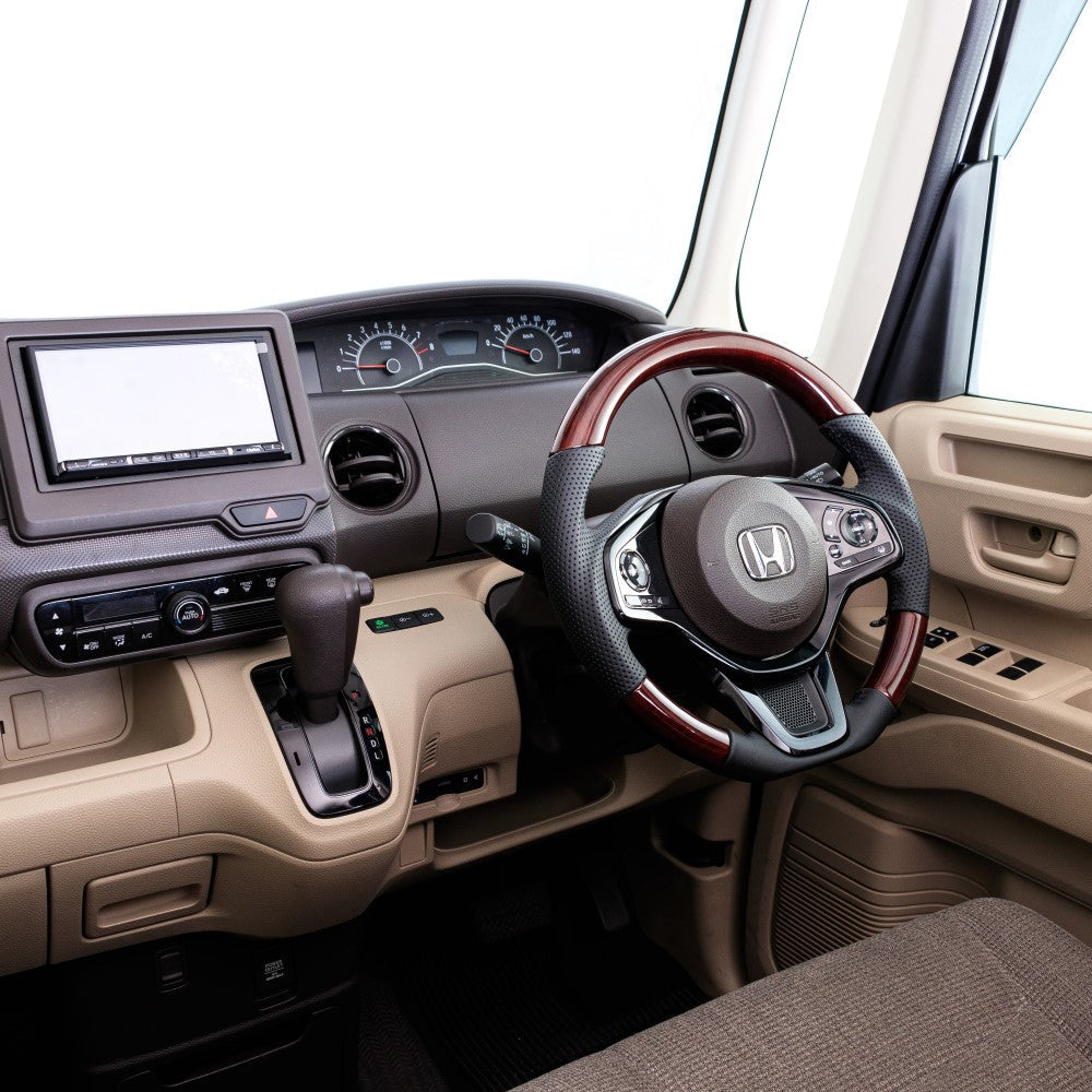 REAL ORIGINAL SERIES SOFT D SHAPE 56 BROWN WOOD BLACK STITCH STEERING WHEEL FOR HONDA N-BOX JF3 JF4 HNC-56BRW-BK