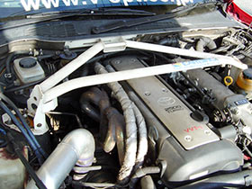 In addition to the stress transmitted from the road surface to the strut upper part through the shock absorber, the weight of the engine etc. in the front section causes a high load (twist) on the body.
