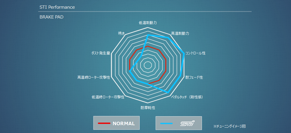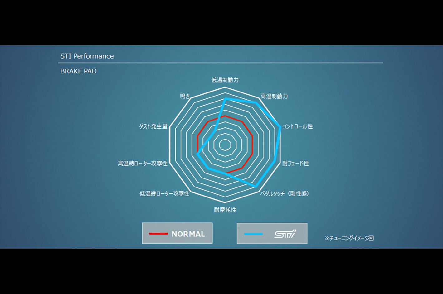 The WRX STI (VA) D type, which has been upgraded to 6-pot front and 2-pot rear, can be combined with the existing brake pad F (ST262964S081) to improve braking performance under various conditions, from winding roads to urban areas. is. By using carbon ceramics as the main component, the braking μ is improved by about 25% in the fade area (at high temperatures and high loads), and the "direct pedal touch" and "brake controllability" required for brake pads. It has been tuned to balance all elements such as "high resistance" and "excellent fade resistance". In addition, the protection of the disc and pad is improved by forming a transfer film (membrane) unique to carbon on the disc surface. With a wear indicator to inform you of the wear limit. Chamfer processed.