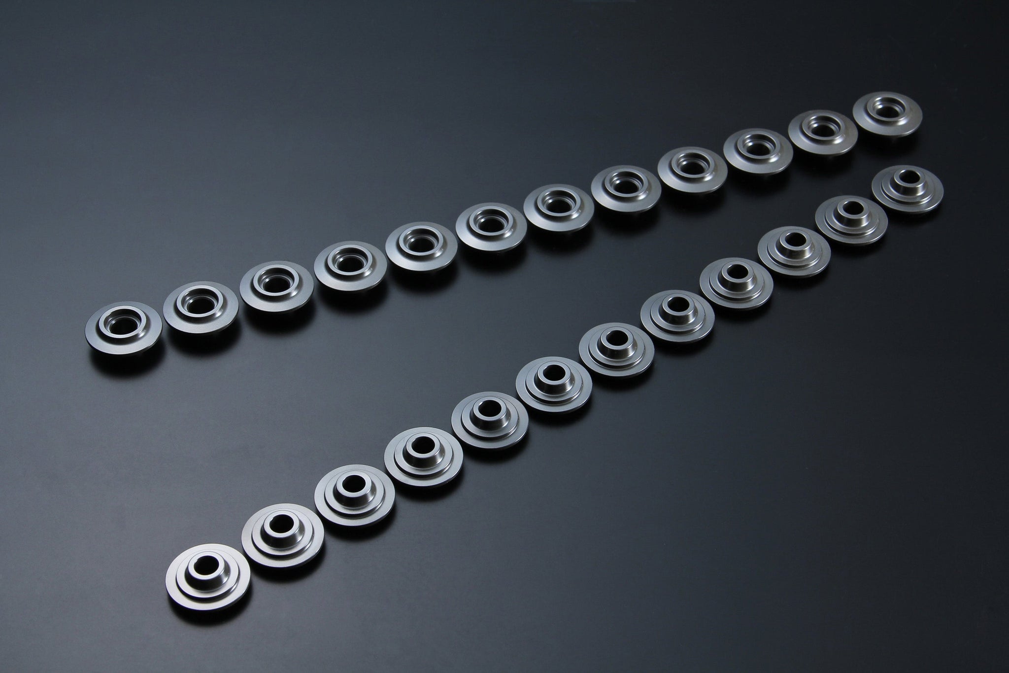 | Product Description | An indispensable part for any high powered, high speed engine. The combination of high lift camshafts and these oversized valves will greatly increase the flow rate for fuel mixture to enter the combustion chamber. When upgrading the Valves to cope with the new high lift camshafts it is also a requirement to upgrade the Valve Springs to suit the new setup. High engine speeds and the dynamic movement of the valve trains mass can cause unwanted stress loads. This can cause abnormal movements such as a Valve jump or Valve bounce which can cause engine failure. The Tomei Retainers are made from Titanium alloy for added weight reduction whilst maintaining the high strength properties and precision required for the nature of its use. This will help keeping the Valves under control and secure the Valve in place during extreme race conditions. < br>APPLICATION: RB26DETT BNR32 BCNR33 BNR34 QTY: SET COMPATIBLE VALVE SPRINGS: FOR TOMEI TYPE A |
