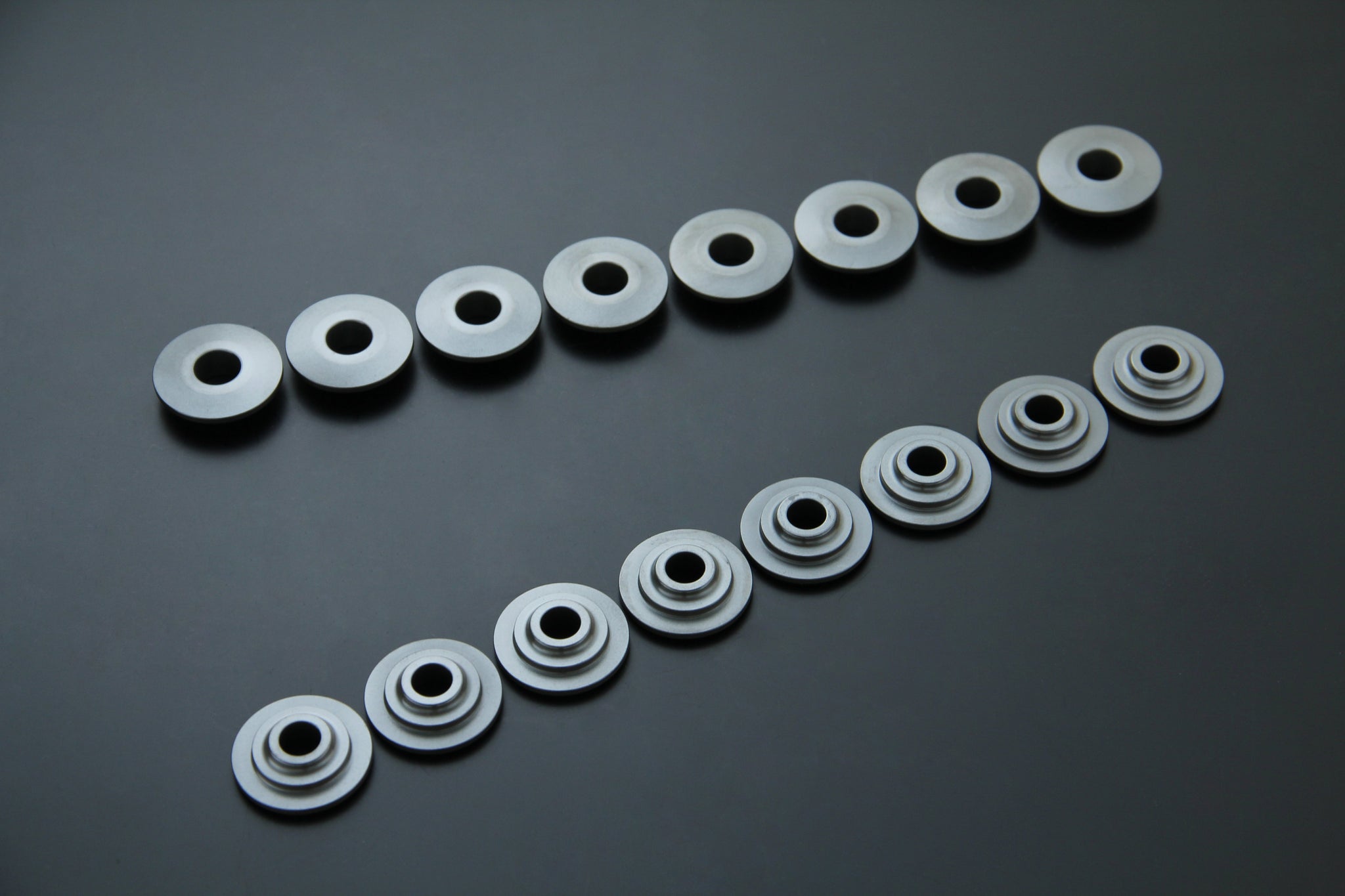 An indispensable part for any high powered, high speed engine. The combination of high lift camshafts and these oversized valves will greatly increase the flow rate for fuel mixture to enter the combustion chamber. When upgrading the Valves to cope with the new high lift camshafts it is also a requirement to upgrade the Valve Springs to suit the new setup. High engine speeds and the dynamic movement of the valve trains mass can cause unwanted stress loads. This can cause abnormal movements such as a Valve jump or Valve bounce which can cause engine failure. The Tomei Retainers are made from Titanium alloy for added weight reduction whilst maintaining the high strength properties and precision required for the nature of its use. This will help keeping the Valves under control and secure the Valve in place during extreme race conditions. < br>APPLICATION: 4B11 G4KF CZ4A HYUNDAI GENESIS
