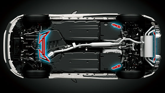 By suppressing the deformation of the body, the performance of the suspension is brought out, the load is firmly transmitted to the tires, and linear handling is realized. By installing it at the same time as the GR door stabilizer, it will be even more effective. Material Steel [Mounting location] ● Front member part: 1 point on one side x 1 ● Front member part: 3 points on one side x 2 ● Rear member part: 2 points on one side x 2 ● Inside the rear bumper: 2 points on each side x 1